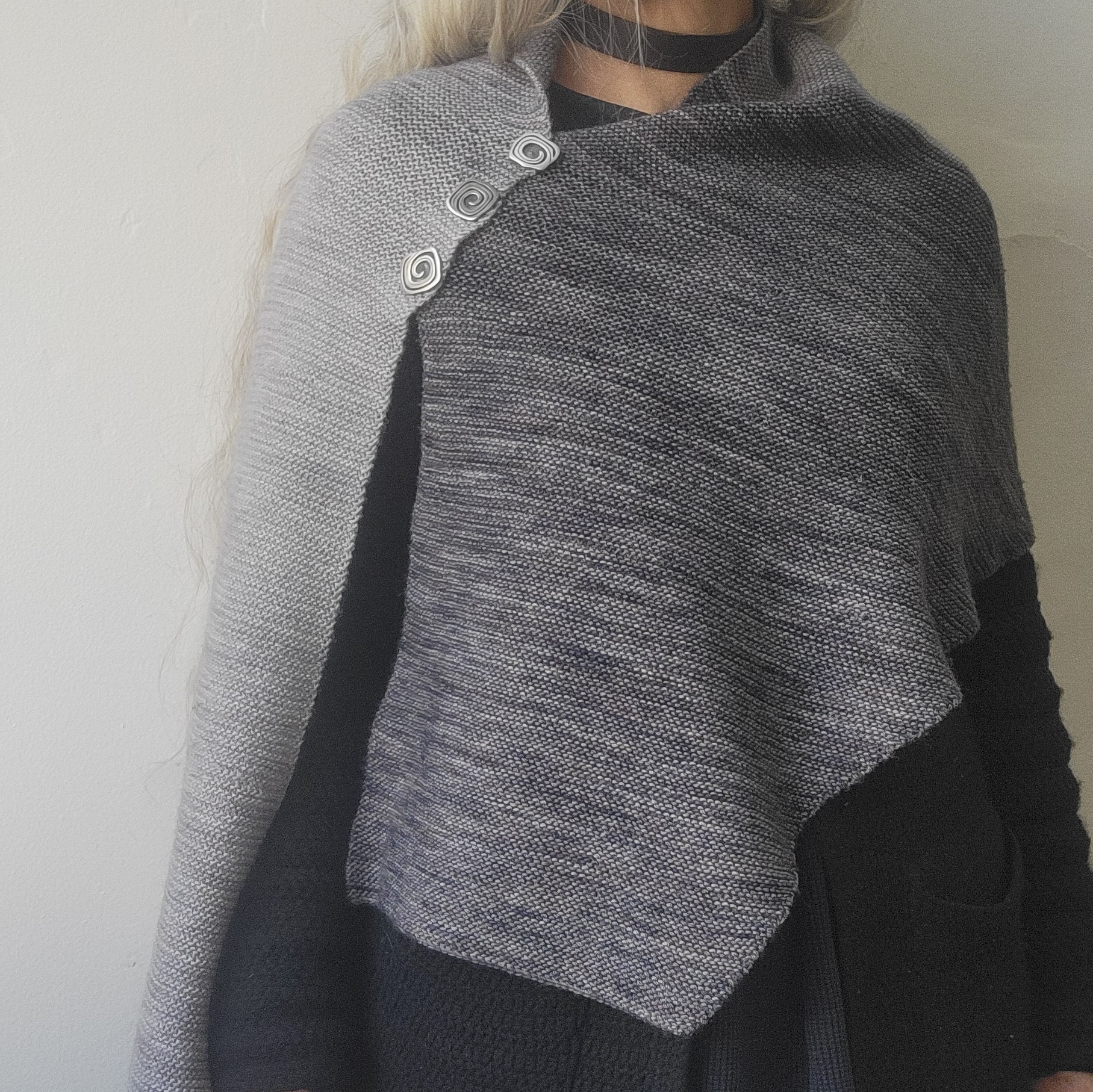 Rotate the shawl one-quarter turn so the stud buttons sit just in front of the shoulder (that way, you can still carry a shoulder bag comfortably if you want to!). Notice how this shift creates flattering diagonal lines across your torso.
